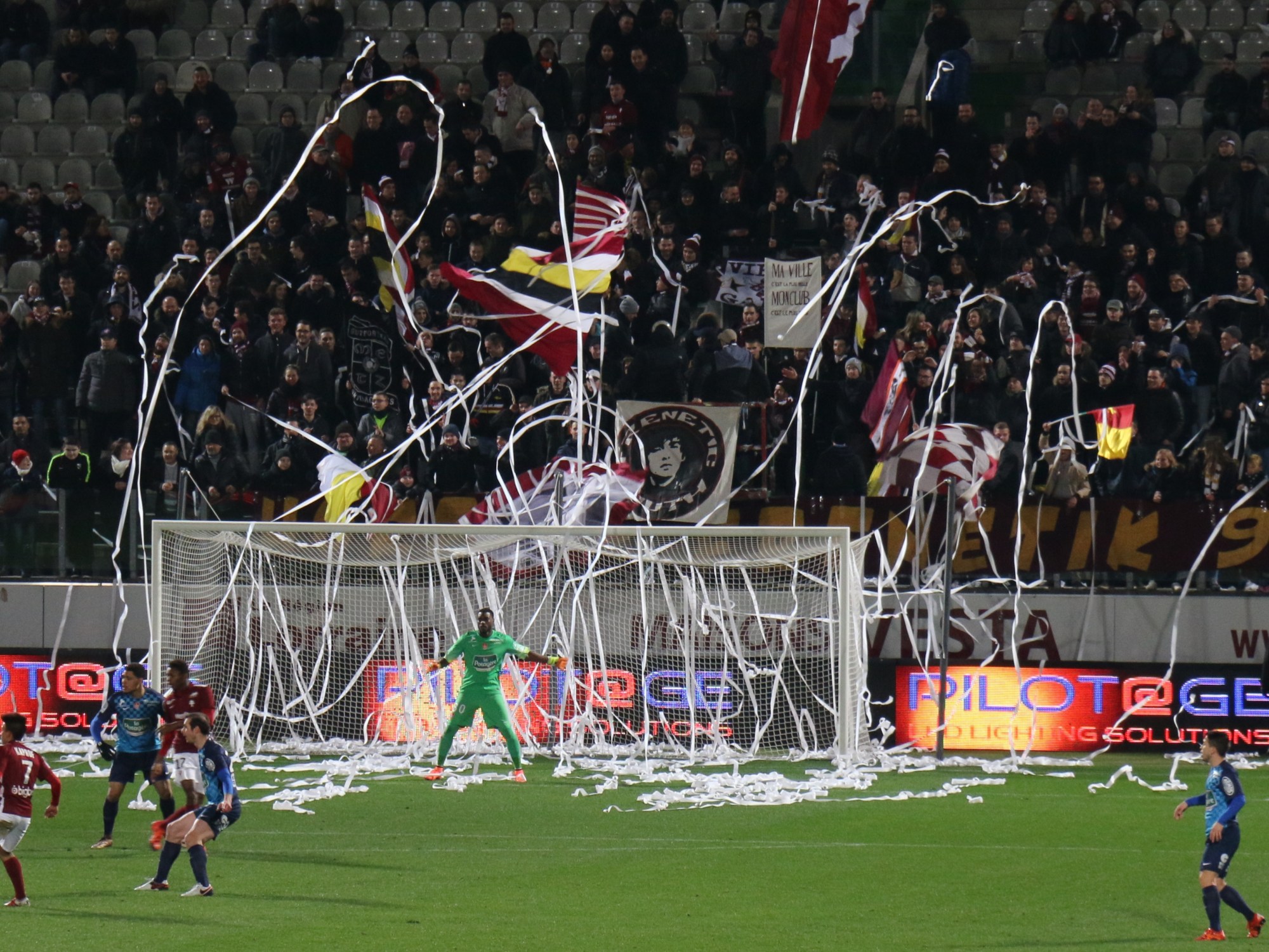 Als die beiden Fanblöcke zehn Minuten vor Anpfiff noch immer komplett verwaist waren, wurde man kurz skeptisch. Acht Minuten vor Anpfiff betraten die beiden Ultragruppierungen Horda Frenetik und Gruppa Metz schließlich auch ihre Blöcke. Es gibt bei einigen Vereinen die Situation, dass sich die aktiven Fangruppen an unterschiedlichen Stellen im Stadion positionieren. So extrem wie in Metz haben wir das aber auch noch nicht gesehen. Gruppa und Horda stehen jeweils in den gegenüberliegenden Hintertor-Blöcken. So zogen beide Gruppen über 90 Minuten auch ihr eigenes Programm durch. Einzige Ausnahme war ein gemeinsamer Wechselgesang kurz vor Schluss. Im Block der Horda waren ein paar befreundete Ultras der Frenetic Youth aus Kaiserslautern zu Gast. Der mitgereiste Anhang aus Brest war nicht erwähnenswert. Handgezählte vier Personen fanden sich im Gästeblock ein.