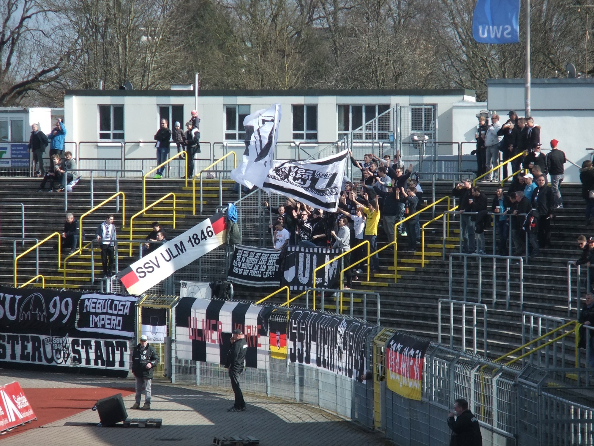 Im Gegensatz zu Pfullendorf verfügt Ulm trotz fünfter Liga über eine aktive Fanszene, welche sich bei unserem Spielbesuch aus ca. 30 Leuten zusammensetzte. Diese waren über die kompletten 90 Minuten am Supporten und konnten auch mit ein paar Schwenkfahnen optische Akzente setzen. Es gelang ihnen jedoch selten, dass sich mehr Ulmer am Support beteiligten.