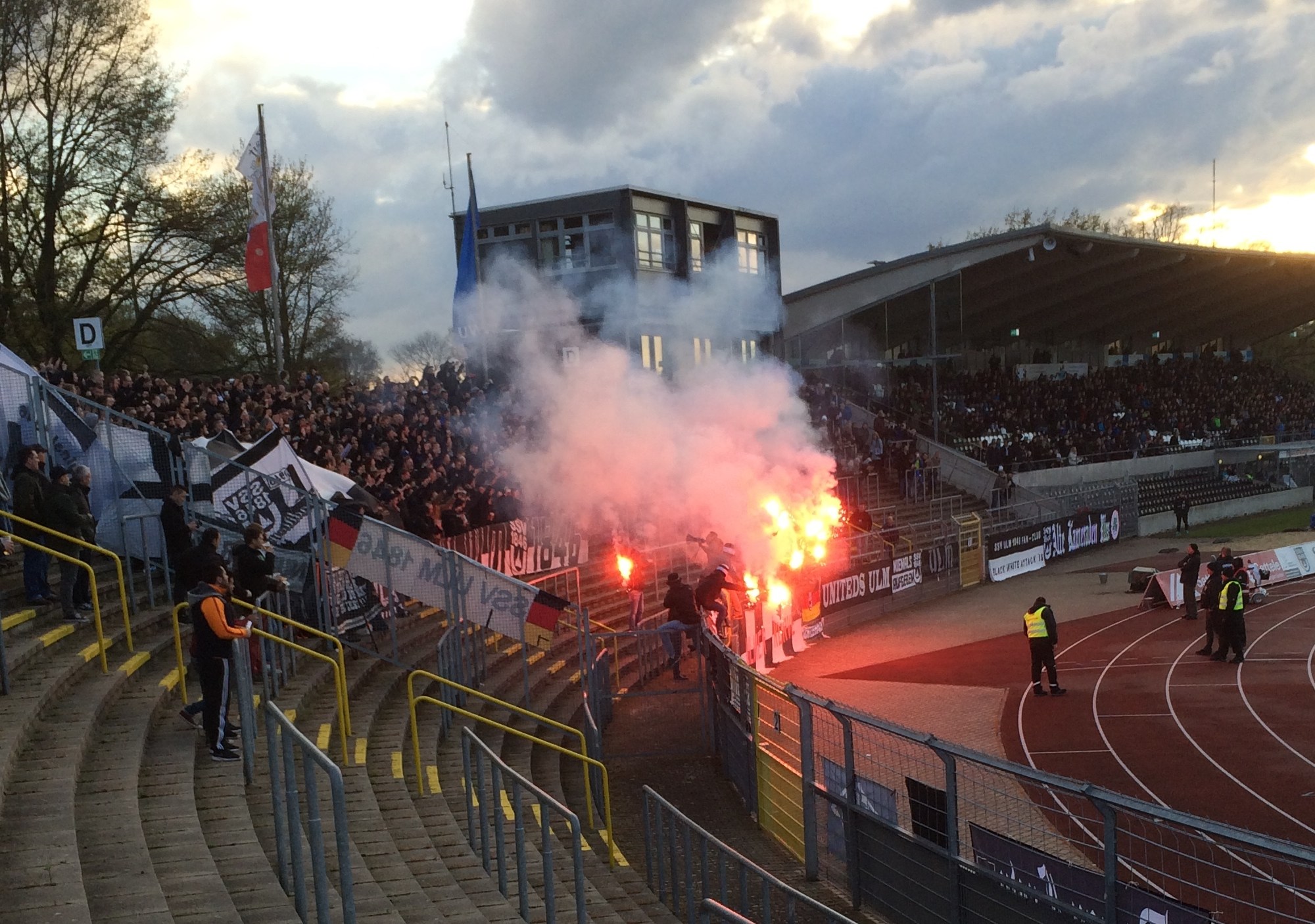 Die Ulmer Fanszene konnte insbesondere akustisch überzeugen. In der ersten Halbzeit gab es mithilfe einer Blockfahne auch noch eine nette Pyroshow. Der Support beschränkte sich vor allem auf Pöbeleien gegen die Gäste. Die Reutlinger zeigten zum Einlauf der Mannschaften ein schönes Fahnenintro. Außerdem gab es zu Beginn der Zweiten Halbzeit eine große Pyroshow mit ca. 20 Fakeln.